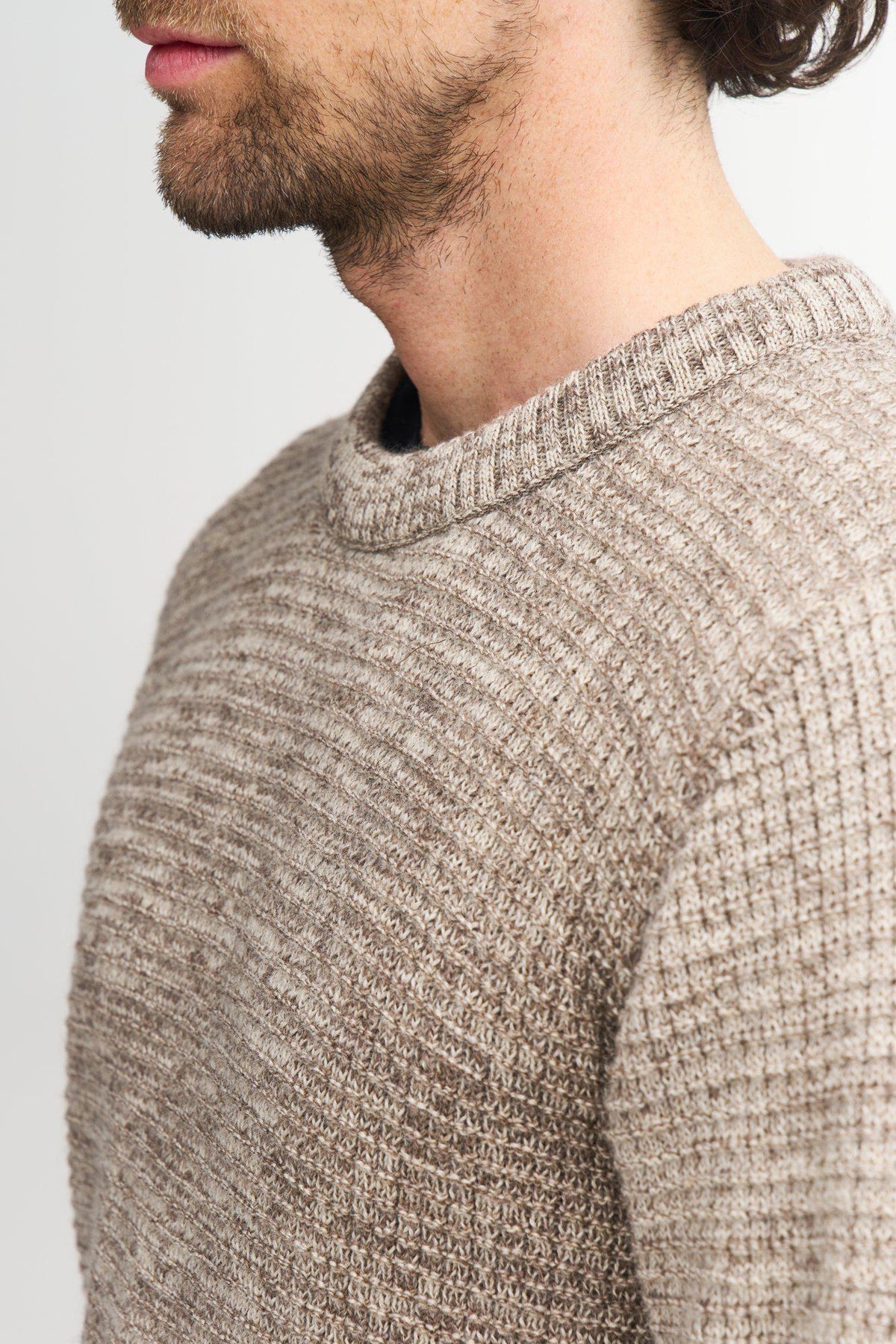 NLS Petal male är en klassisk ulltröja med rundhals i strukturstickning. Luftig och lätt att bära i kombination med ullens värmande egenskaper. Snygg till ett par jeans. Ribbstickad mudd nertill i ärm och body samt i halsremsa. Stickad i 100% ren ull.