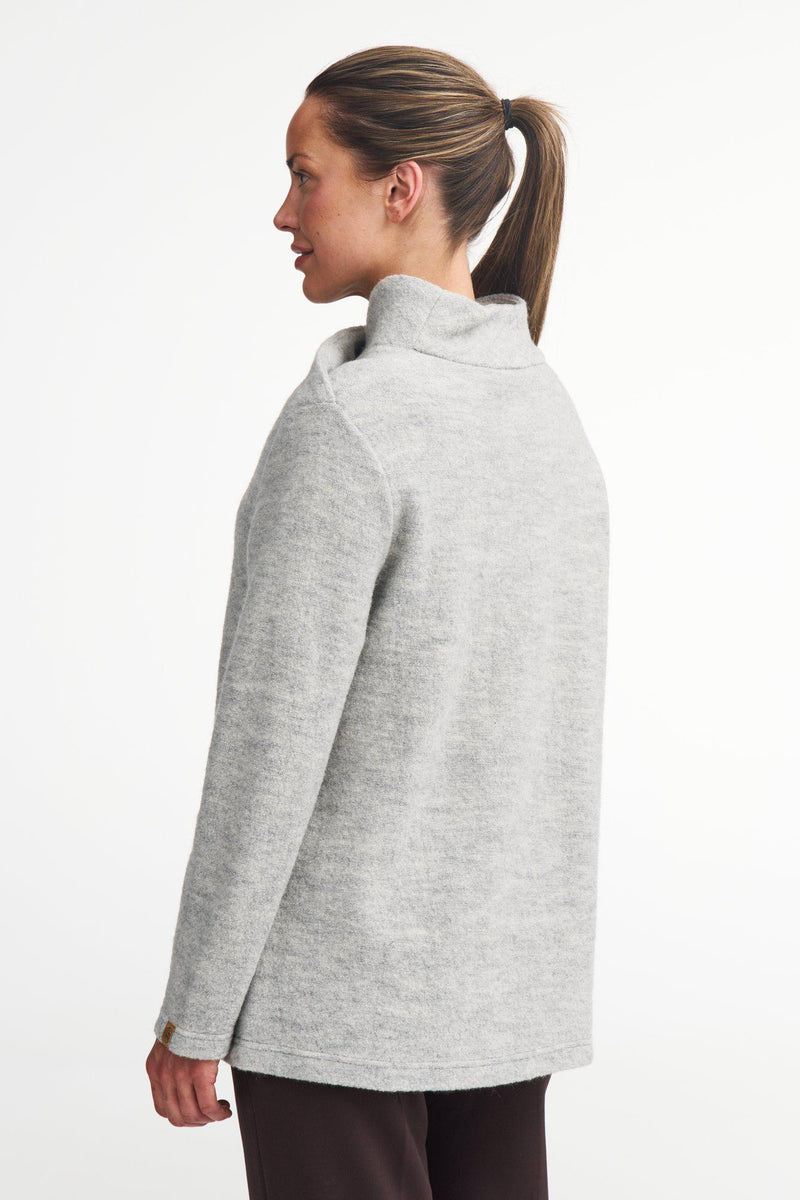 Großzügig und locker geschnittener Pullover mit drapiertem Kragen, gestrickt in unserer 450g gewalkten Wollqualität in 100% Sport Loden. Kleines Ivanhoe-Logo am unteren linken Ärmel. Doppelgrößen: S=36/38, M=40/42, L=44/46