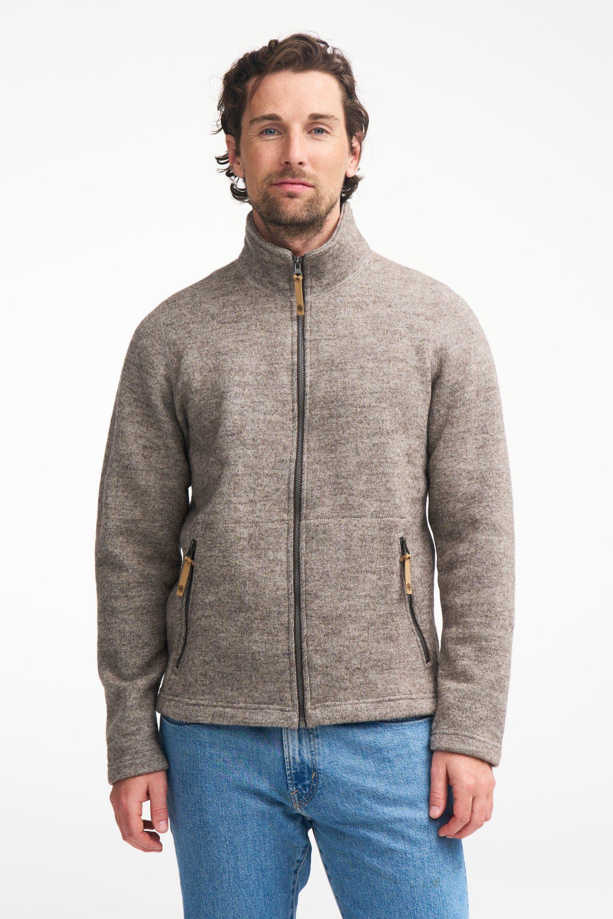 Jacke mit durchgehendem Frontreißverschluss und seitlichen Reißverschlusstaschen. Die Jacke ist aus einem natürlichen Wollgarn gestrickt, das weder gefärbt noch chemisch behandelt wurde. Bei ihr wird die sonst innen liegende Seite nach außen getragen und sie unterscheidet sich deshalb von unseren anderen Jacken aus gewalkter Wolle. Logo-Badge aus Jacron am linken Oberarm und Reißverschluss-Puller aus Jacron.