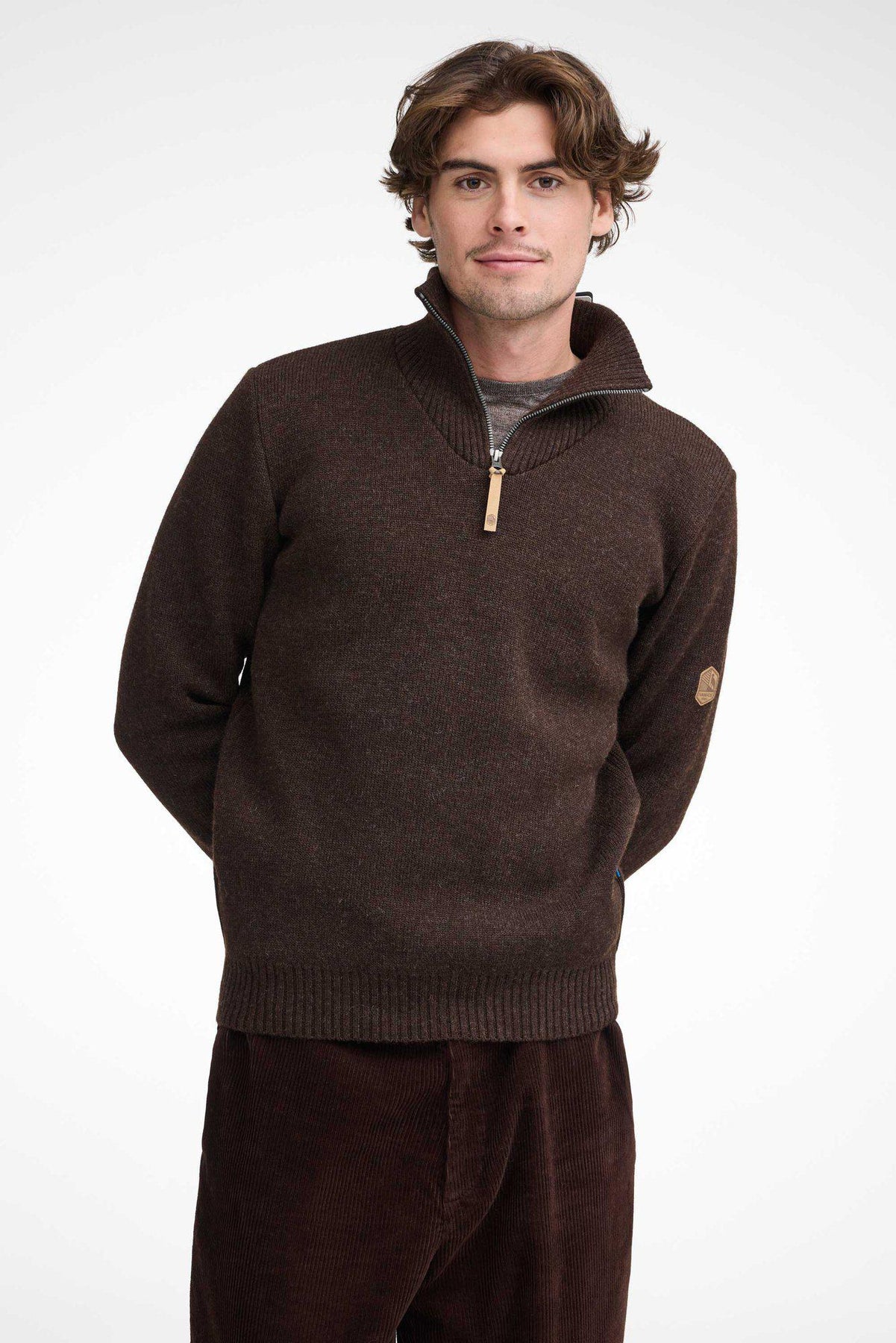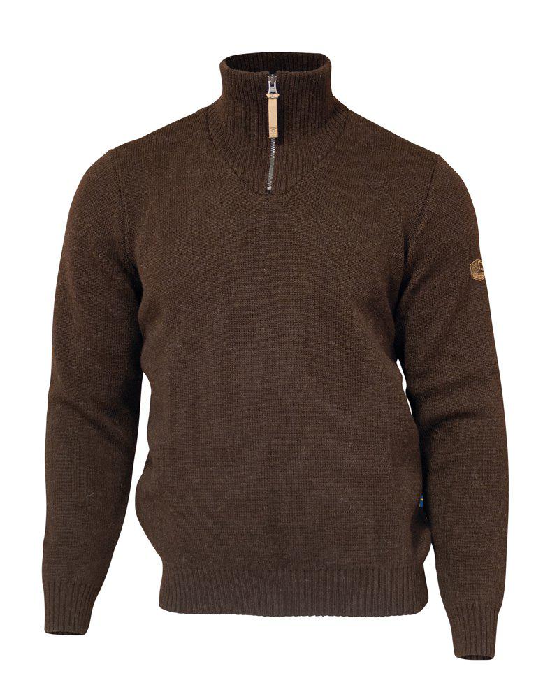 Troyer mit Reißverschluss und robustem Rippstrickkragen. Der Pullover ist aus 100% reiner, ungefärbter Wolle gestrickt. Logo-Badge am linken Oberarm.