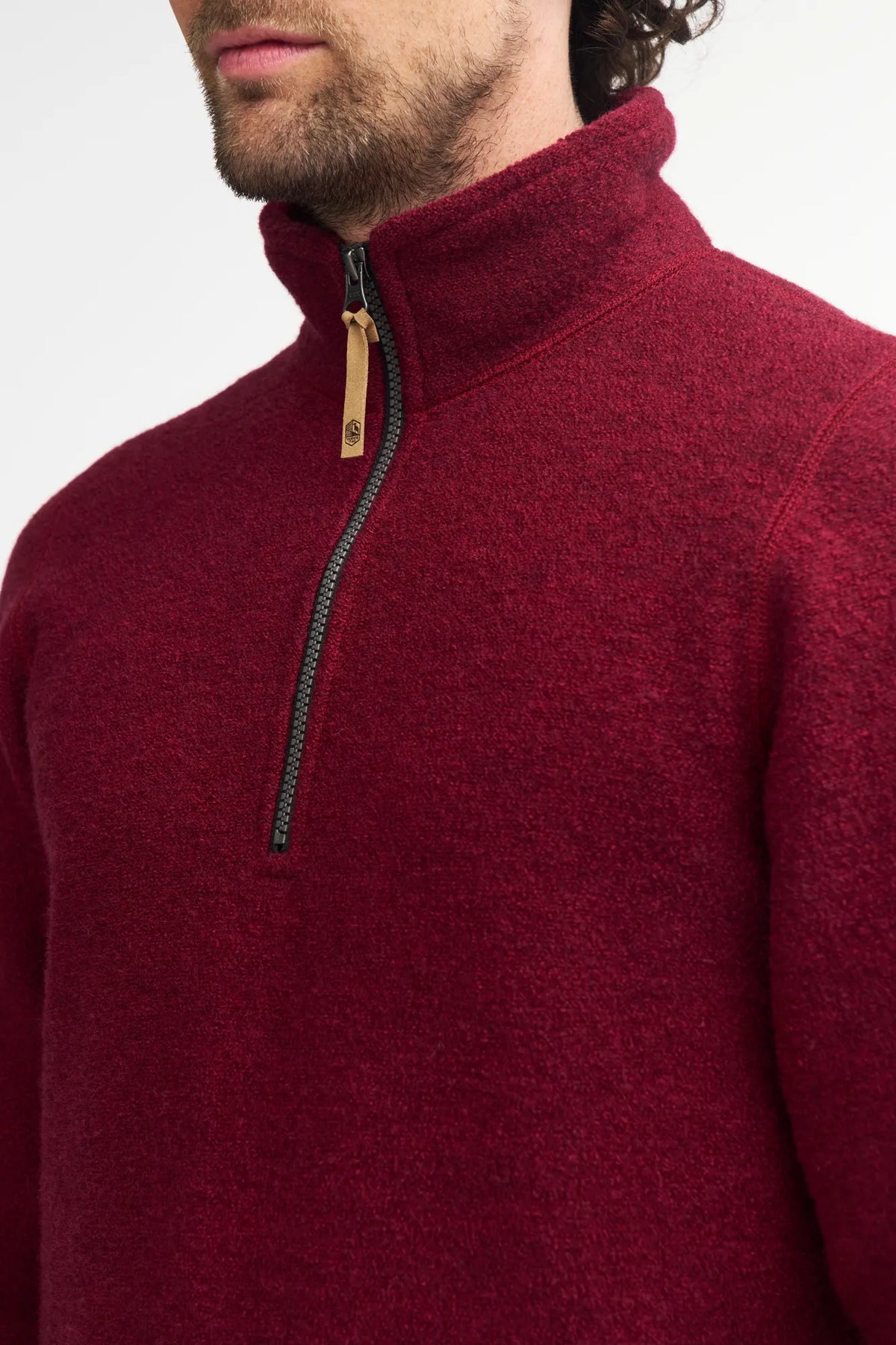 Classic half zip style with drawstring at bottom and logo badge on upper left arm. Zip puller in jacron, a material made of paper.