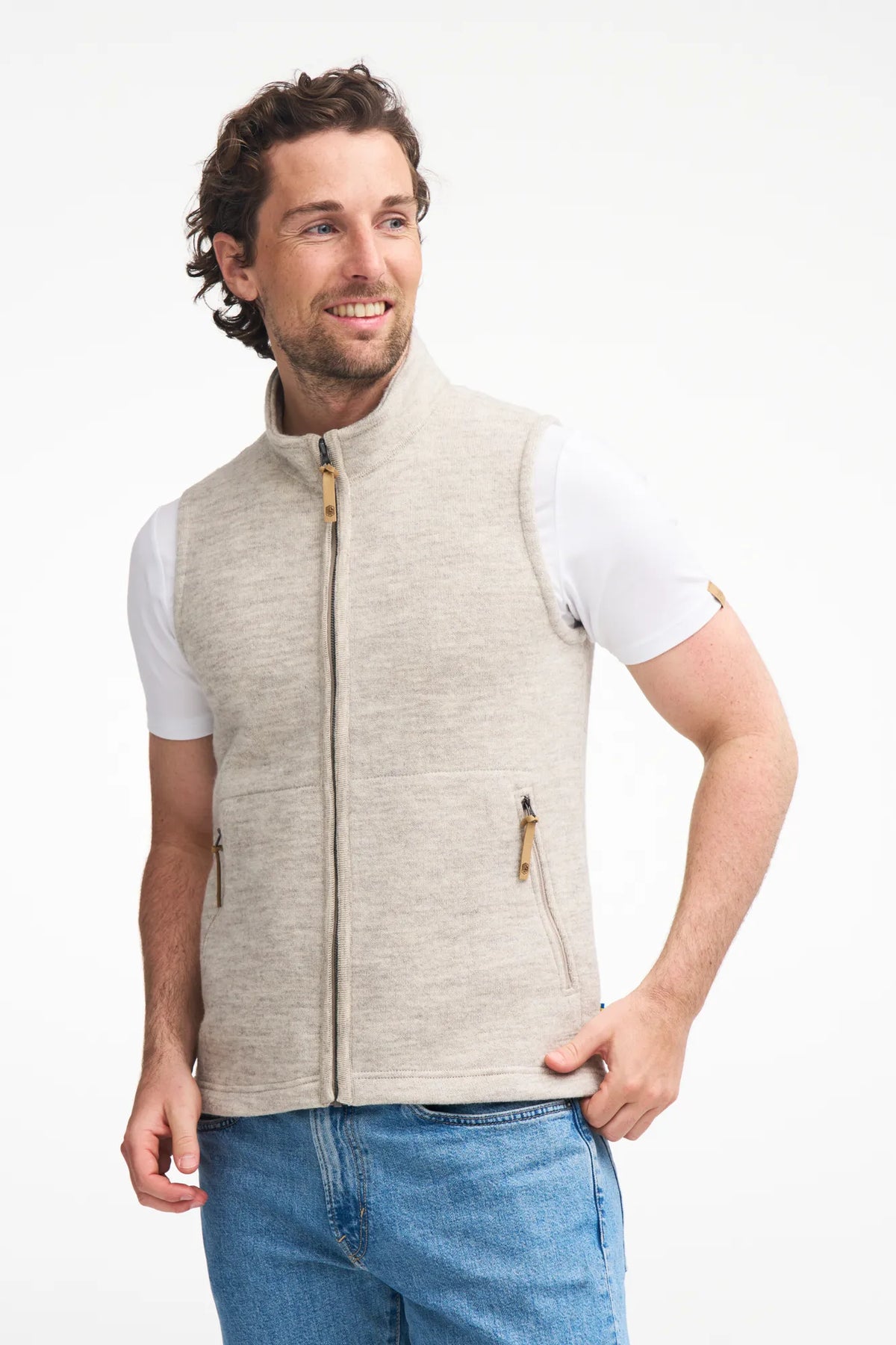 This vest is knitted in 100% pure undyed wool. Front zip is hidden behind a knitted band, which gives a very nice design effect. Side pockets with zip and logo badge down at left, front side.