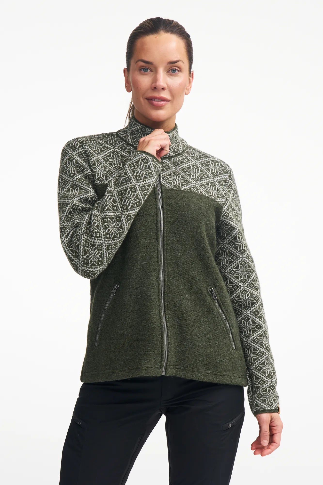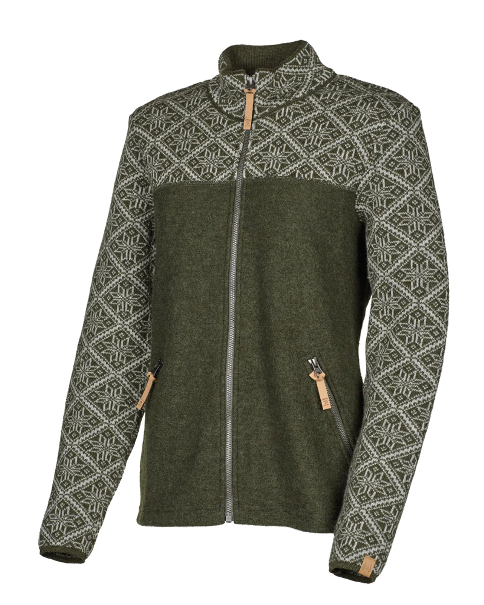 A warm and cozy wool jacket with a very unique design where jaquard knitted yoke and arms are combined with our uniqe boiled wool quality, all in 100% wool. Full zip at front and zipped side pockets. Small logo in jacron down at left arm.