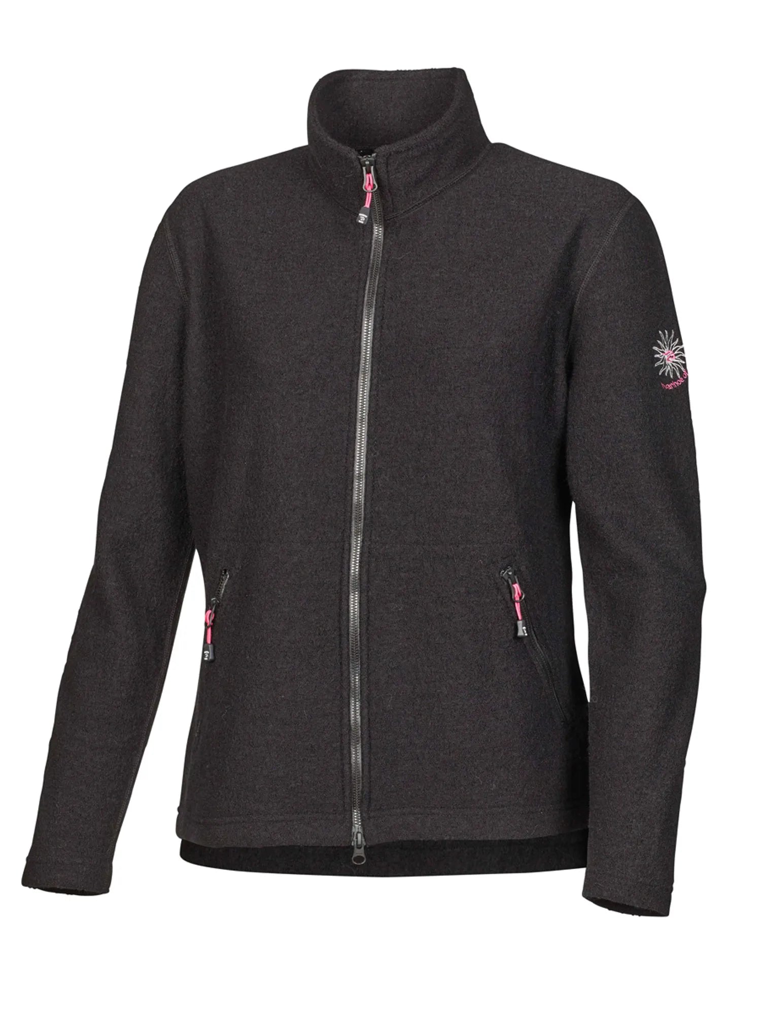 Wool jacket in our thin, stretchy 325g boiled wool quality. Introducing a new kind of zipper that is more flexible and soft, and therefore in perfect harmony with the knitted material. 2-way zip at front and zipped side pockets. Embroidery on upper left arm in matching colours.