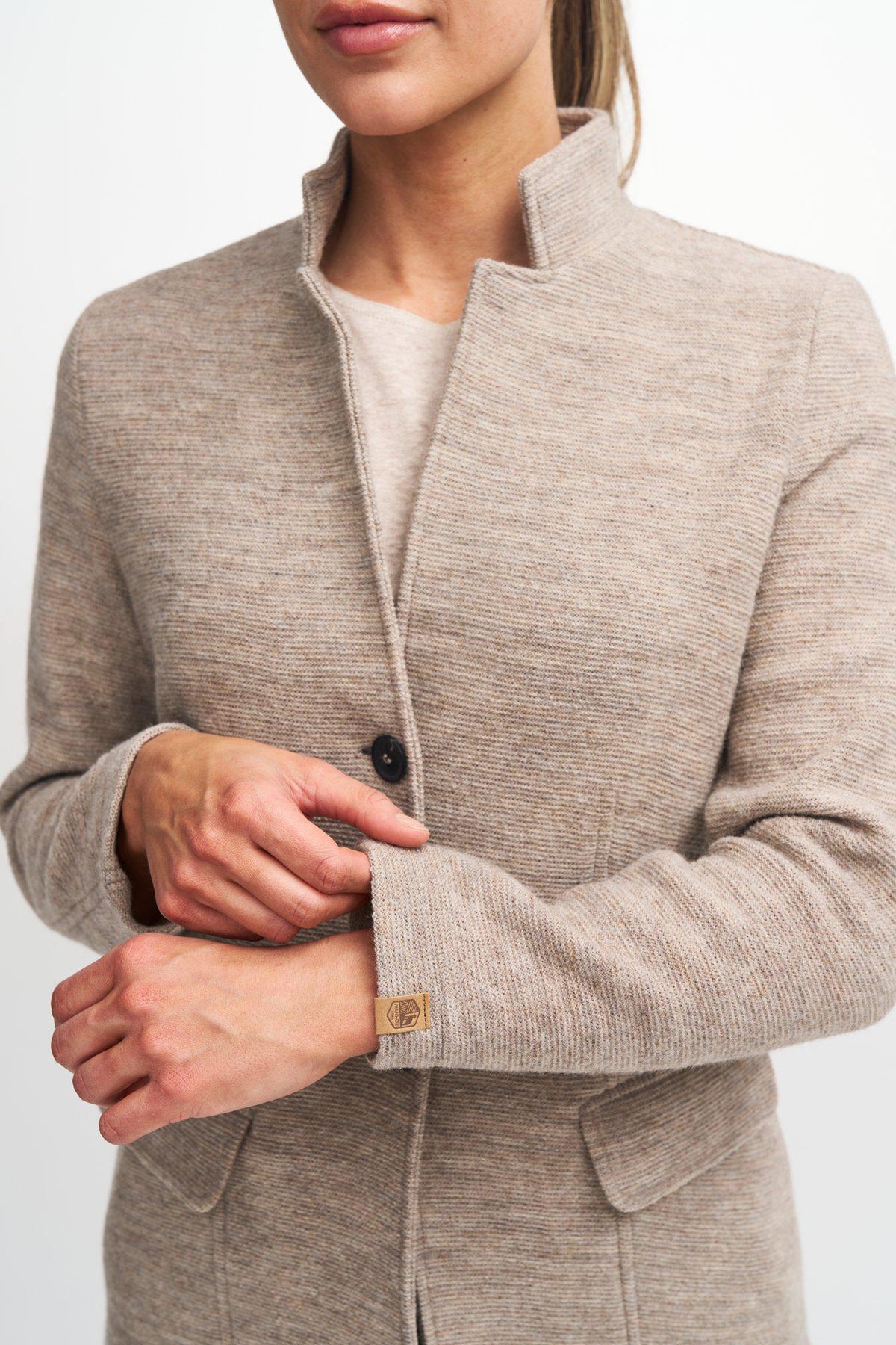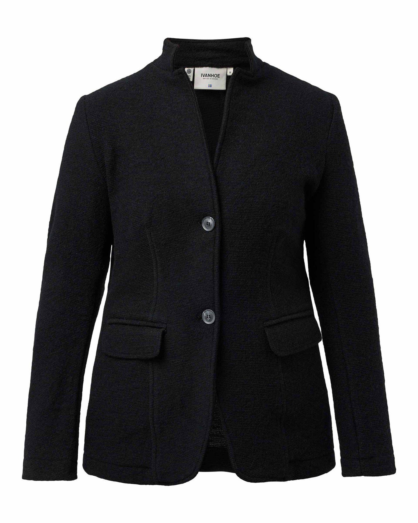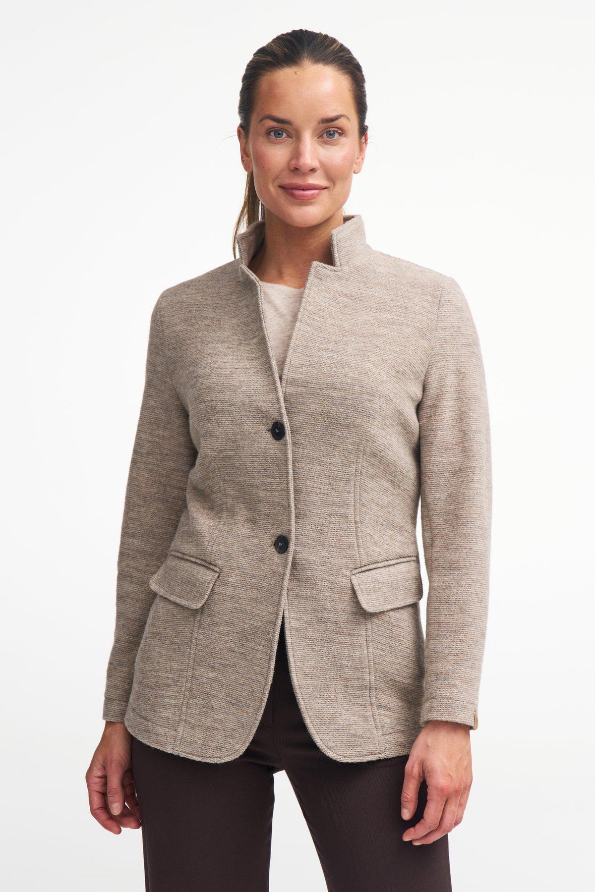 This thin wool jacket has a luxurious expression and great fit. Knitted in 100% wool and has two buttons at front made of recycled paper. Side pockets with pocket flaps and small logo badge down on left arm.