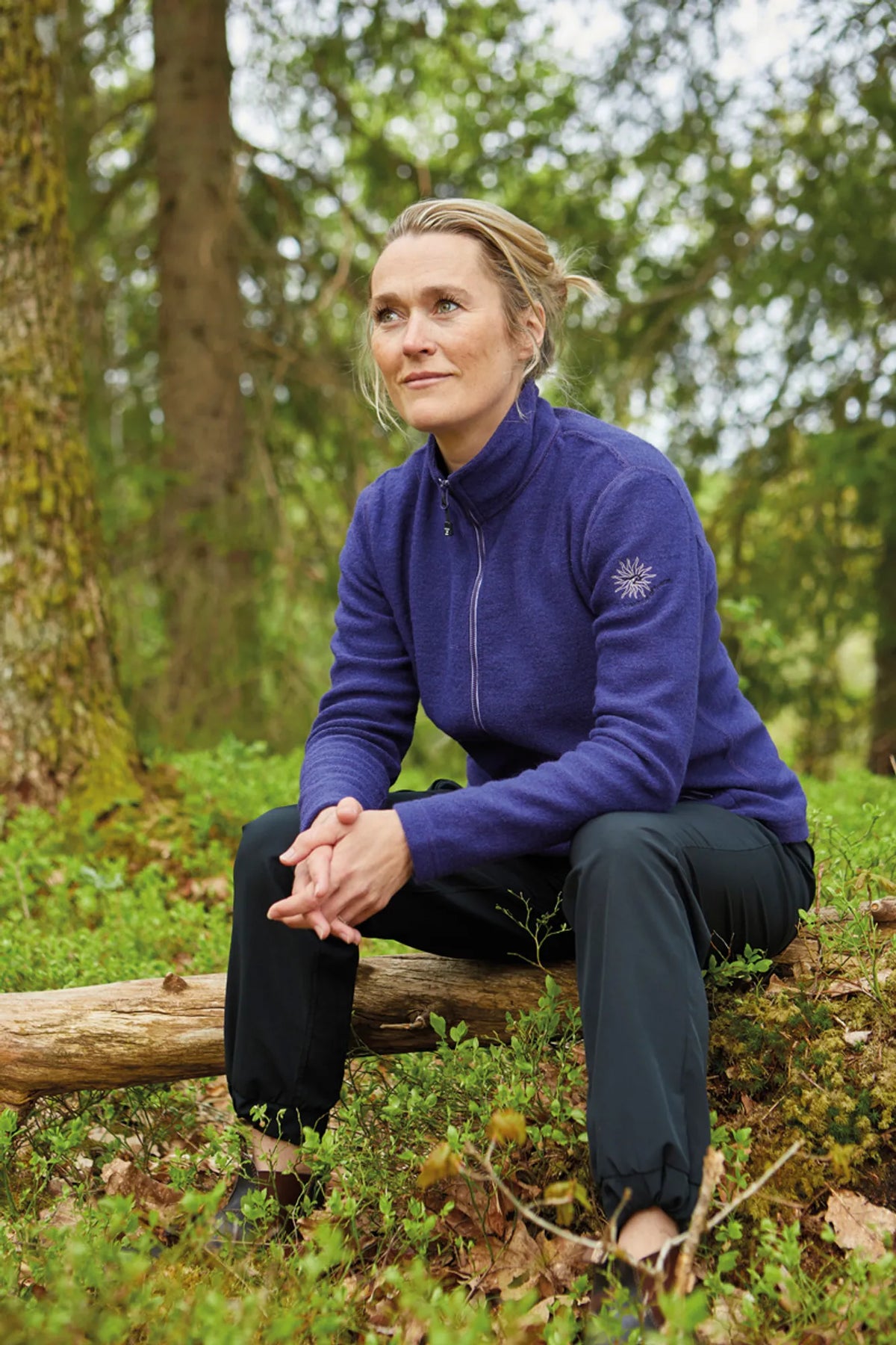 Wool jacket in our thin, stretchy 325g boiled wool quality. Introducing a new kind of zipper that is more flexible and soft, and therefore in perfect harmony with the knitted material. 2-way zip at front and zipped side pockets. Embroidery on upper left arm in matching colours.