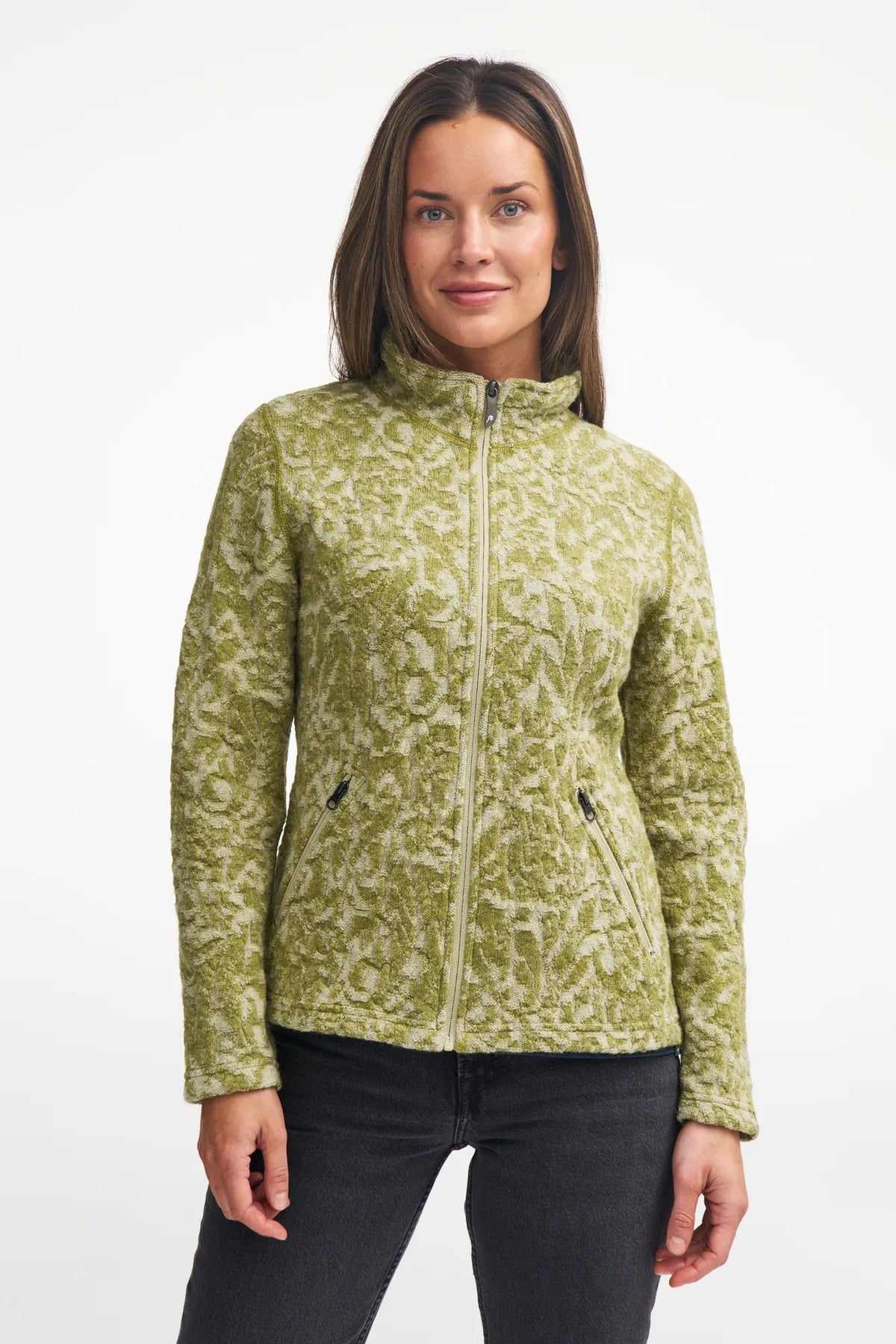 Beautiful jaquard knitting in 100% wool. Two shades of yarn are combined in 4 beautiful variants. Full zip at front and zipped side pockets. Small jacron badge down at left arm.