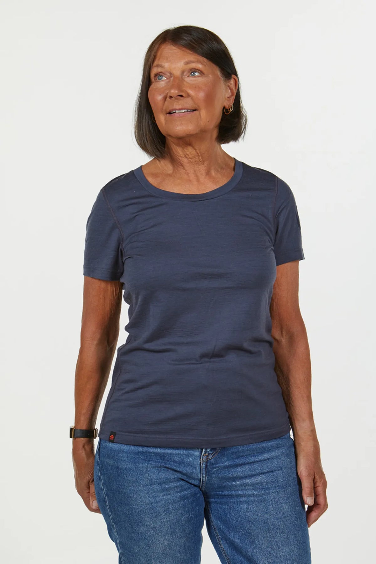 The perfect basic t-shirt in 100% extra fine Merino, micron count 18,5. Feminine neck drop, embroidery on upper left sleeve and flat lock seams tonal to body colour.