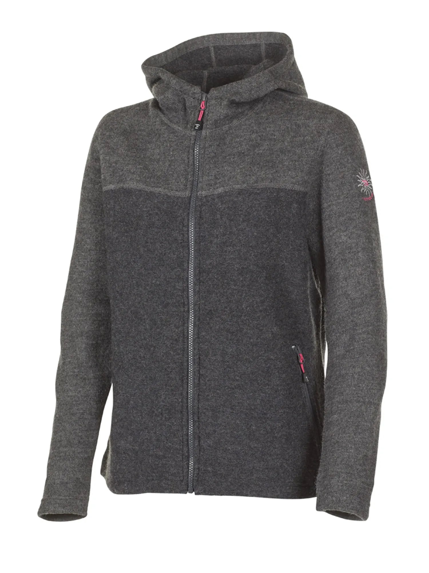 Material is knitted in 100% wool, where wool is mulesingfree and yarn Bluesign® certified. This great hooded full zip jacket is equipped with zipped side pockets. Both sides of the two-faced material is used, which gives both a tonal and structural design effect. Colour effect on zip pullers and the embroidery on upper left arm.