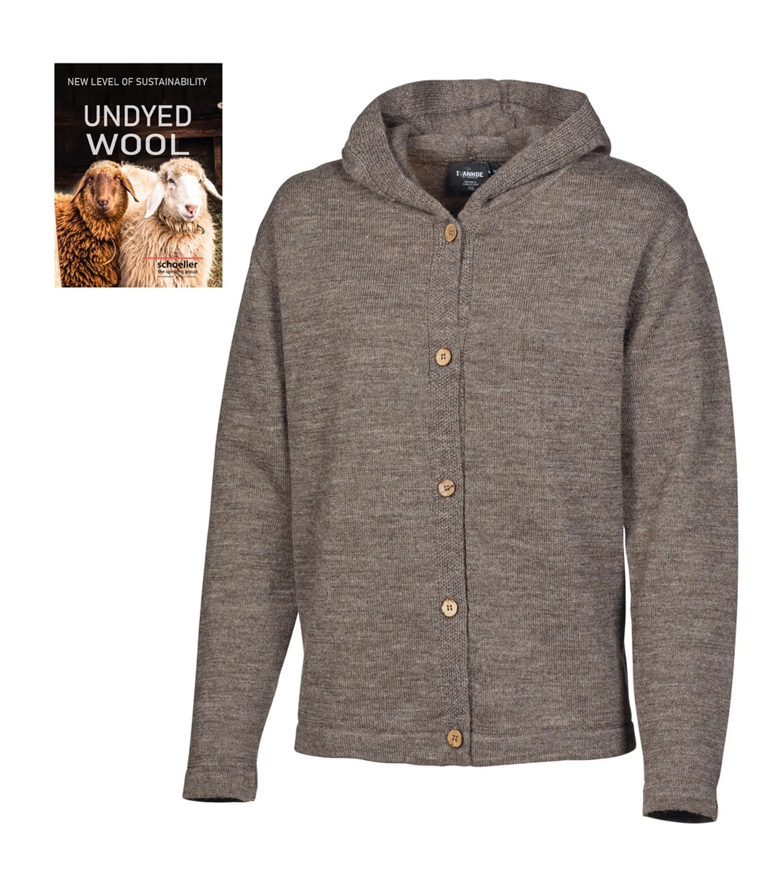 Super cozy hoodie knitted in our NLS yarn, which is totally natural with no dyes or chemicals added. Buttons at front are made of coconut shell. Small logo badge in jacron down at left arm opening.