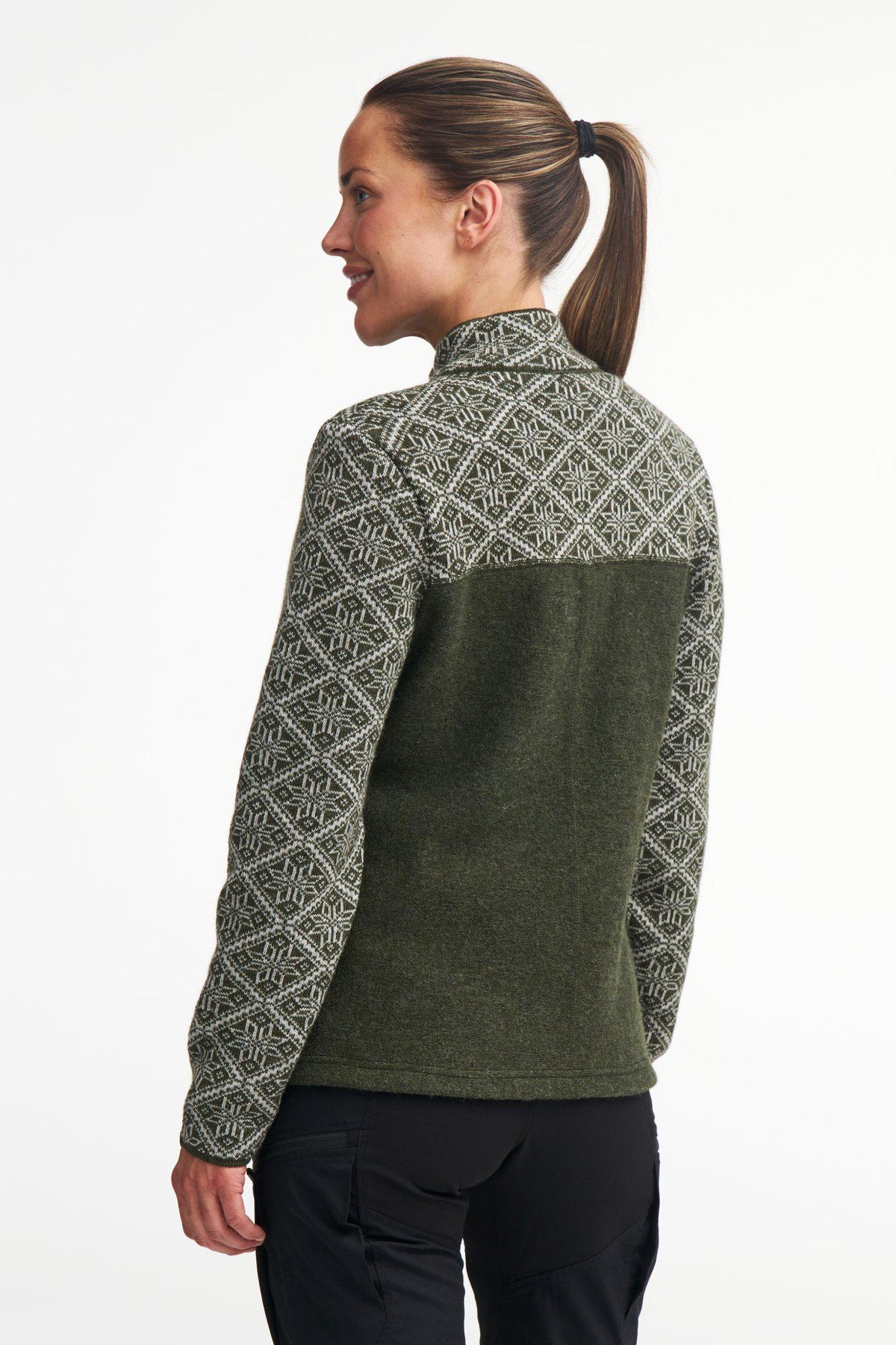 A warm and cozy wool jacket with a very unique design where jaquard knitted yoke and arms are combined with our uniqe boiled wool quality, all in 100% wool. Full zip at front and zipped side pockets. Small logo in jacron down at left arm.