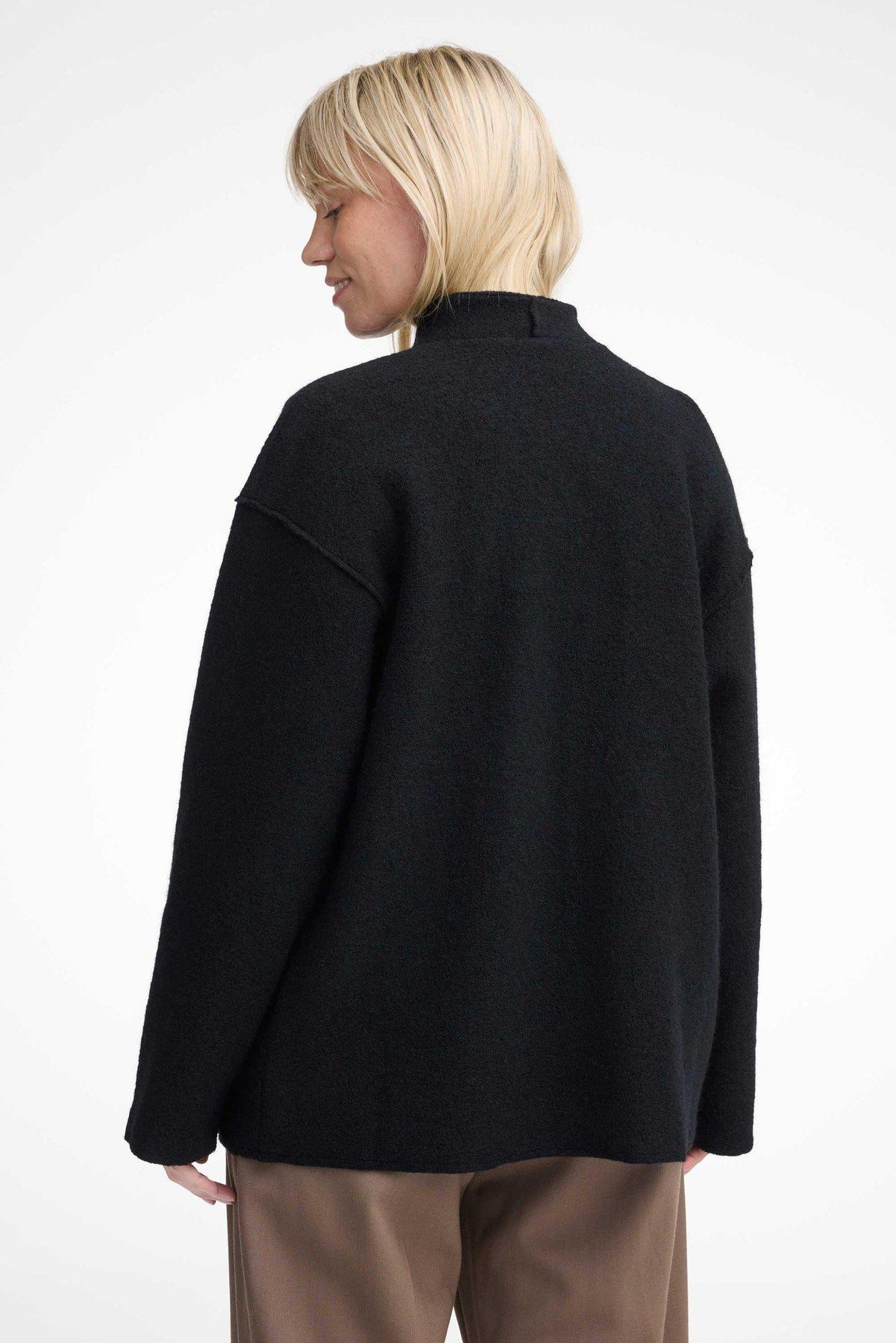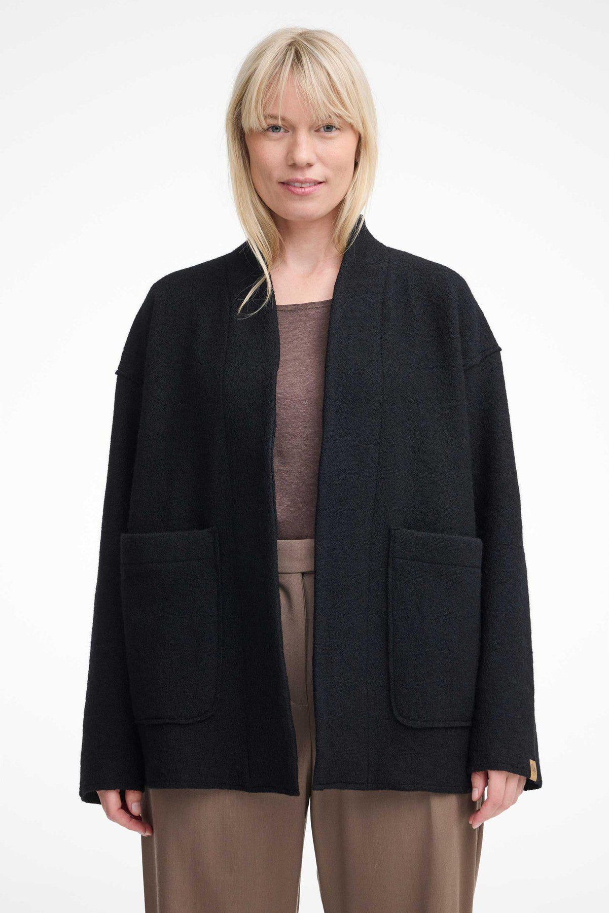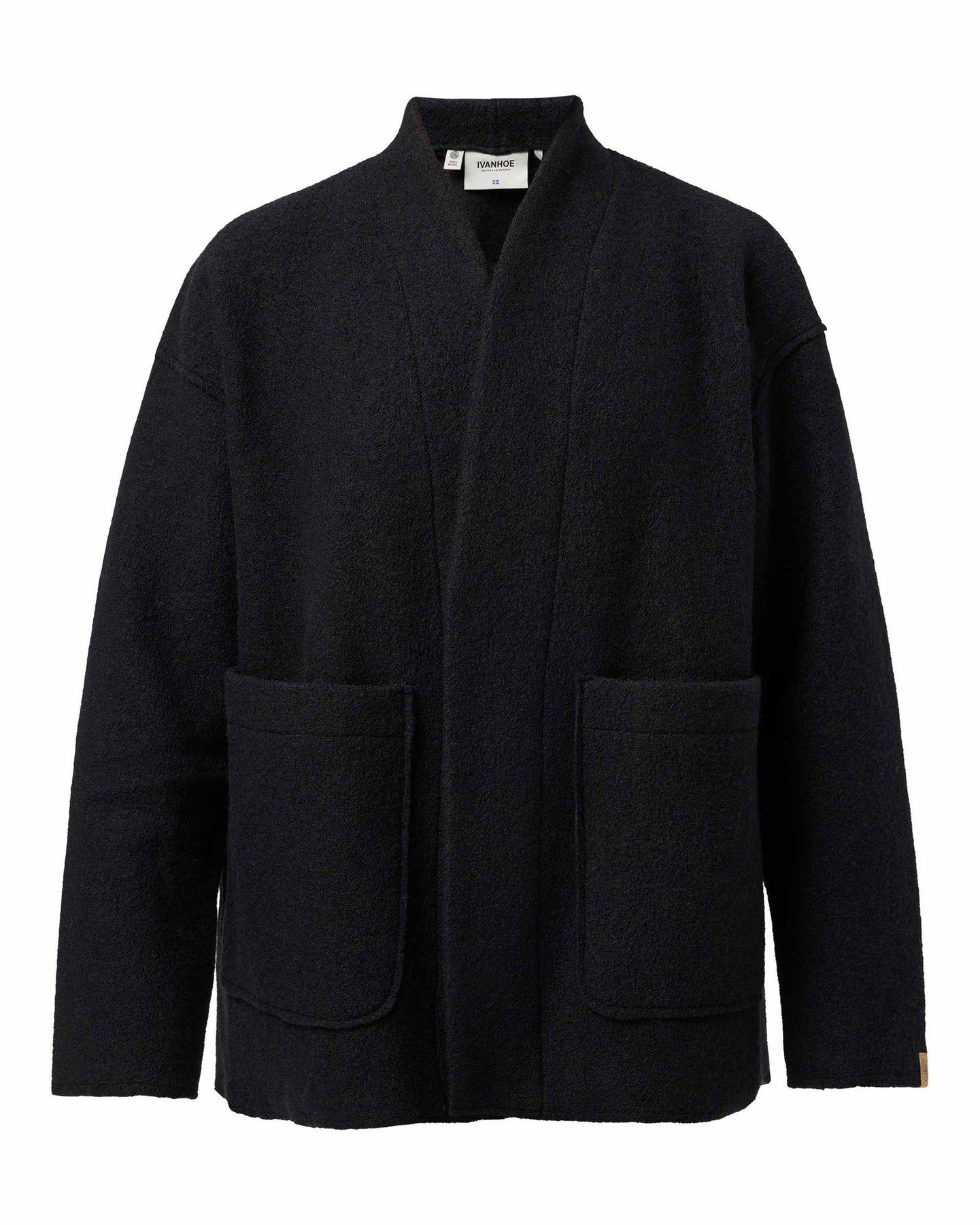 Open jacket in 450g boiled wool. Genereous side pockets, raw edges and seams for extra design effect. Oversize in fit and with a small, tasteful logobadge down on left arm opening.